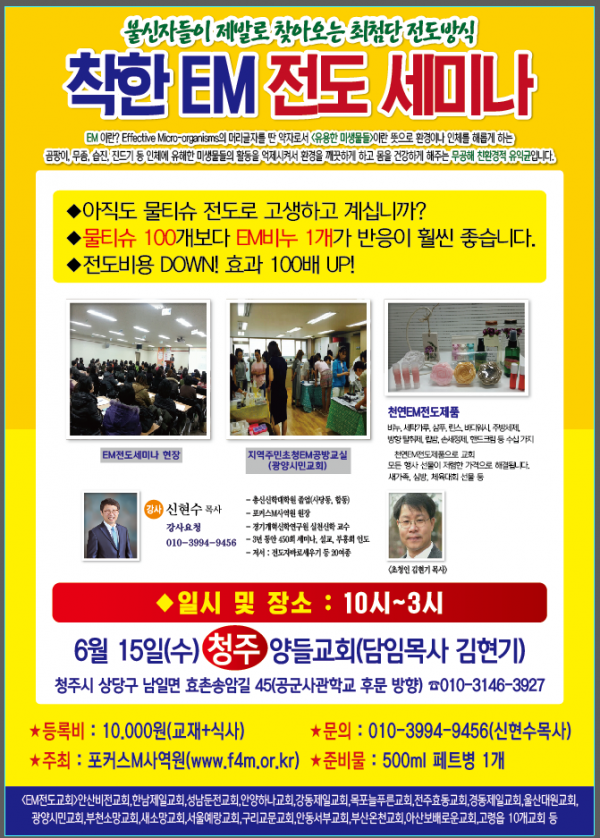 EM전도세미나(6월 일정) 페이지 정보 작성자 관리자 작성일17-12-27 23:33 조회2,726회 댓글0건 관련링크 이전글 다음글 목록 답변 본문 EM전도세미나(6월 일정) 댓글목록 등록된 댓글이 없습니다. 이전글 다음글 목록 답변