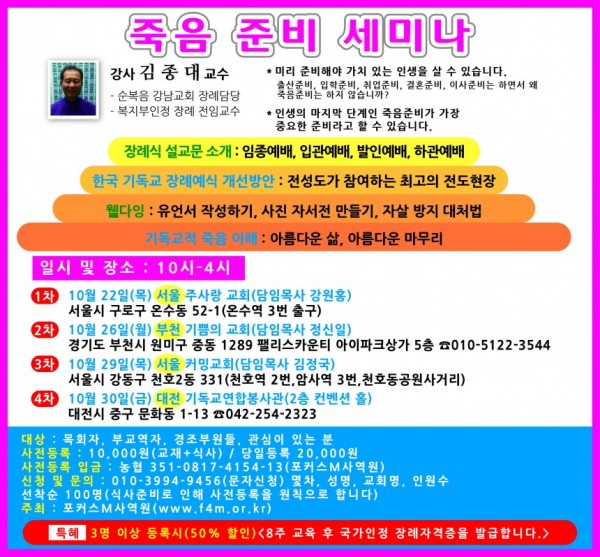 죽음준비세미나(15년10월일정) 페이지 정보 작성자 관리자 작성일17-12-27 23:27 조회2,714회 댓글0건 관련링크 이전글 다음글 목록 답변 본문 죽음준비세미나(15년10월일정) 댓글목록 등록된 댓글이 없습니다. 이전글 다음글 목록 답변